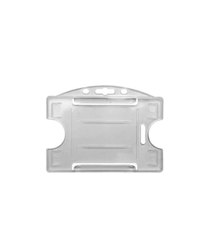 Fabricado con plástico traslúcido, dispone de una cara visible y una cara cubierta por la parte trasera para otorgarle más seguridad. Este modelo permite llevar los credenciales/tarjetas en horizontal.