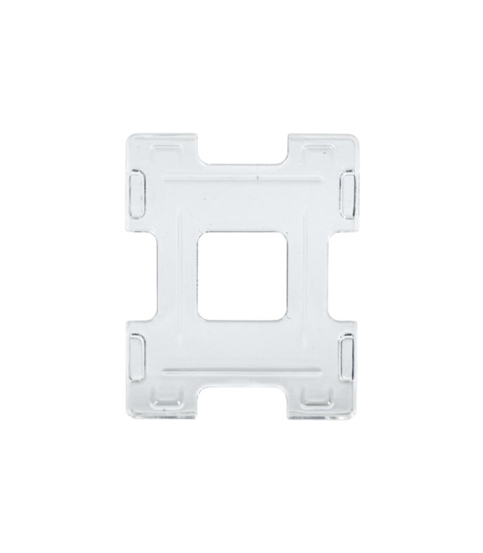 Portatarjetas doble de policarbonato transparente para 2 tarjetas CR80. Permite mostrar las tarjetas una junto a la otra o superpuestas, ideal para aumentar la superficie de impresión o combinar información y promociones. Resistente a impactos y al calor.