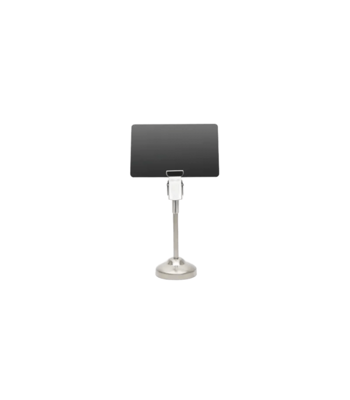 Soporte metálico alto para buffet en acero inoxidable y zinc, con pinza superior para sujetar tarjetas de cualquier grosor o formato. Diseño elegante y estable, ideal para identificar platos en buffets y estanterías. Paquete de 5 unidades. Disponible en dos alturas para adaptarse a sus necesidades.